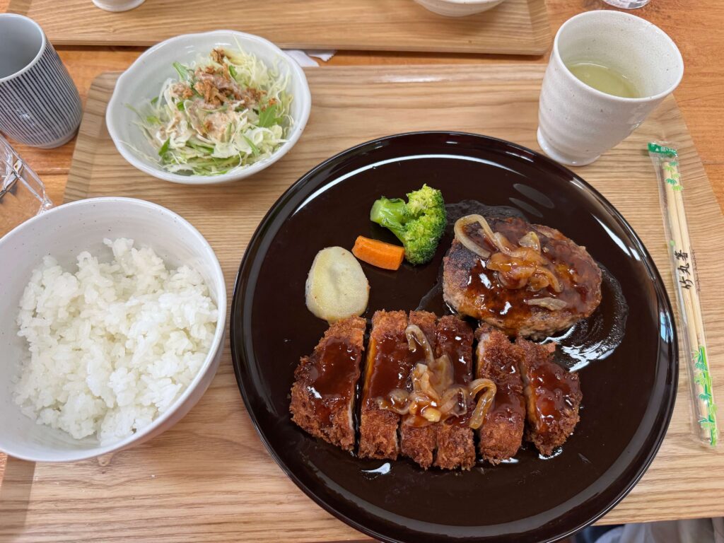 ハンバーグは柔らかくてジューシー、ロースカツは食べ応えあって美味しい。